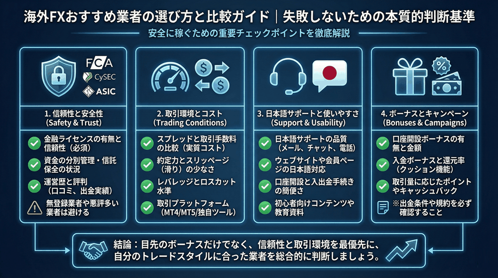 初心者が海外FXで最初につまずくのは、「何を基準に選べばいいかわからない」という点です。